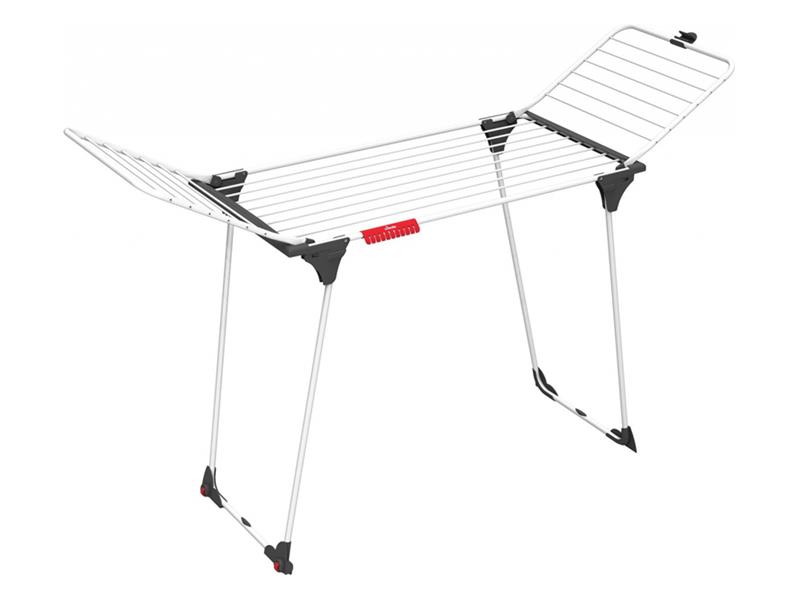 Praktický sušák, nabízející extra stabilitu a snadné sušení. Dostatek místa pro až dvě pračky prádla poskytuje celkem 20 metrů sušící plochy. Díky silným drátům je zamezeno přílišnému mačkání prádla a tím se usnadňuje žehlení. Ocelové nohy dodávají stabilitu a robustnost, možnost fixního upevnění zabraňuje riziku náhodného uzavření. Vybaven přídavným sušákem drobného prádla. Snadno uzavíratelný, lze jej skladovat vodorovně, zámek křídel je udrží bezpečně uzavřená.