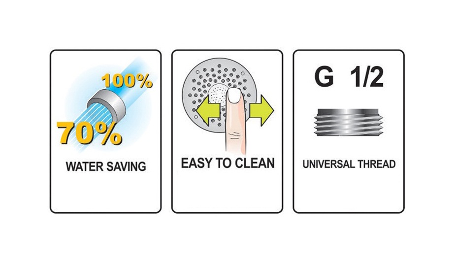 Hlavice je opatřena mechanizmem pro úsporu vody. Proti hromadění vodního kamene slouží gumové kanálky.