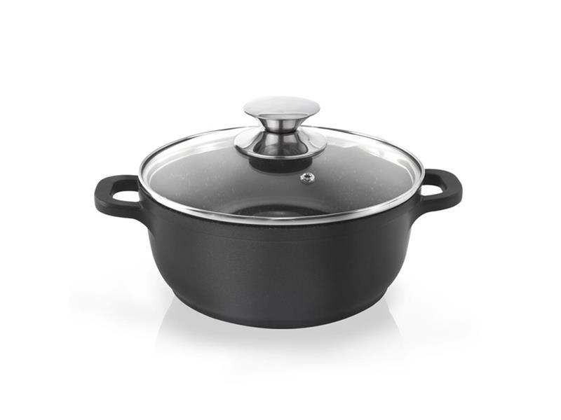 Masivní hrnec s poklicí s velmi kvalitním nepřilnavým povrchem PFLUON GRANIT. Můžete v něm vařit, smažit, dusit, opékat a zapékat s minimální potřebou tuku. Připravovaný pokrm se nepřipéká. Poklice s otvorem pro únik přebytečné páry. Vhodný na všechny typy spotřebičů včetně indukce a trouby.