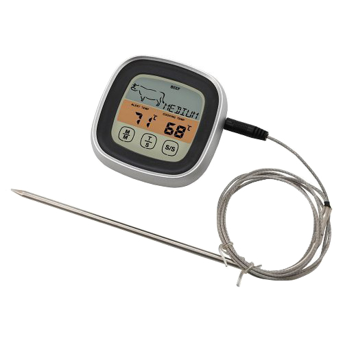 Praktický digitální teploměr pro grilování, s odepínatelnou nerezovou sondou a dotykovým displejem pro snadné používání.
