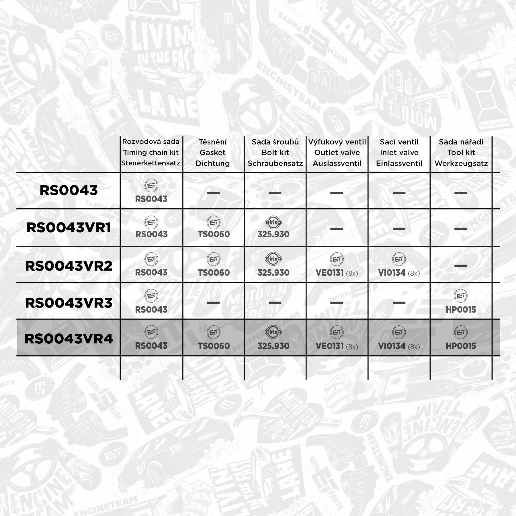 Sada ET ENGINETEAM RS0043VR4 obsahuje tyto díly: