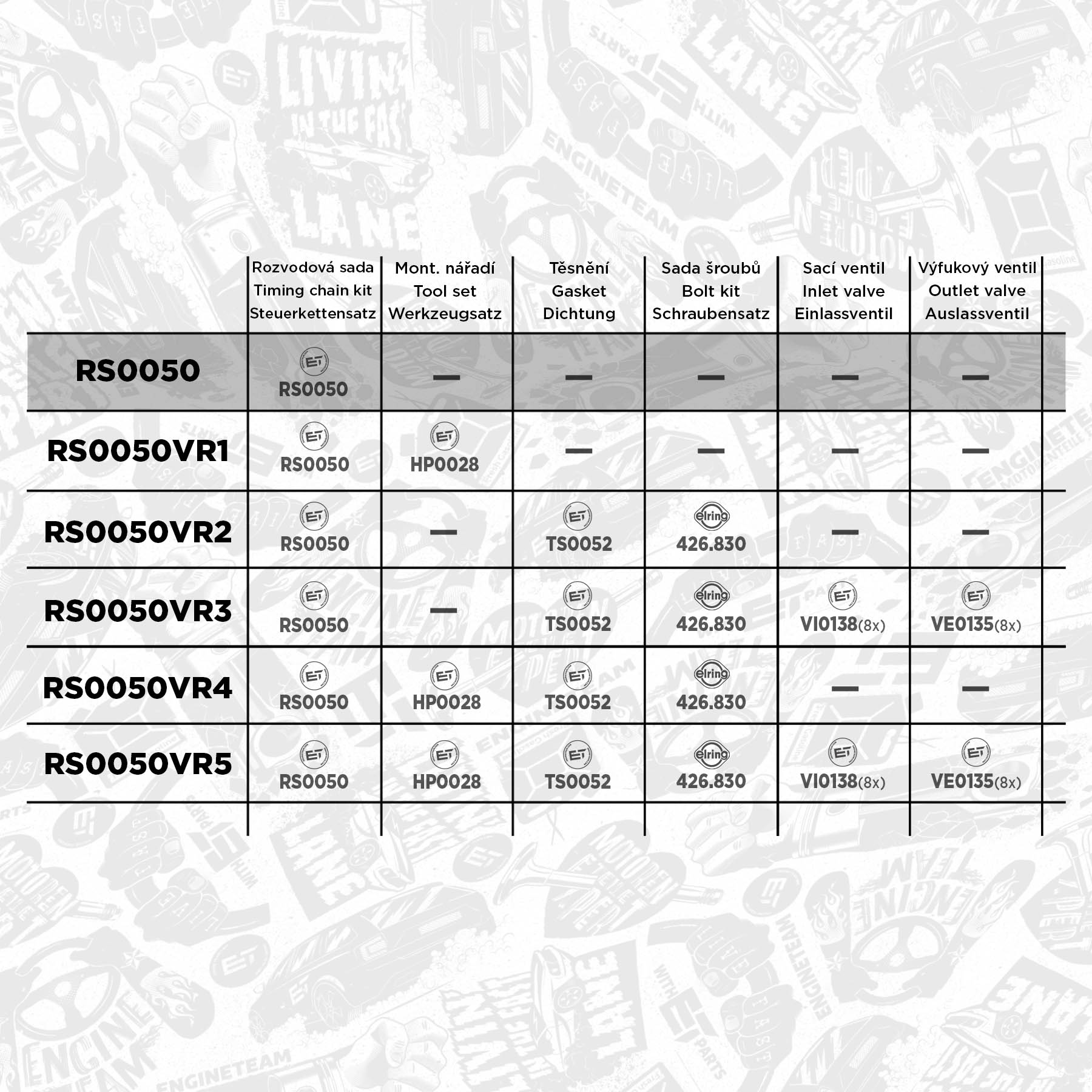 Sada ET ENGINETEAM RS0050 obsahuje tyto díly: