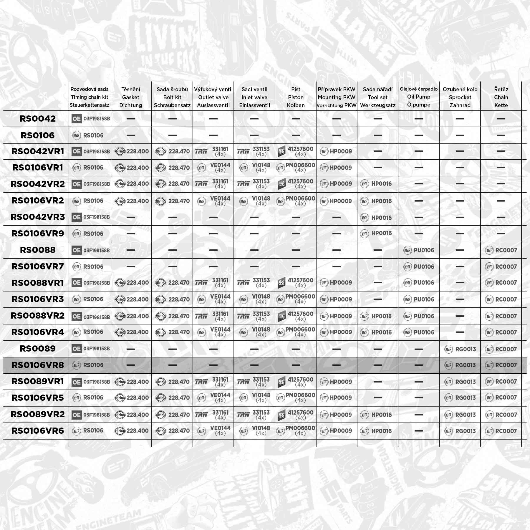 Sada ET ENGINETEAM RS0106VR8 obsahuje tyto díly: