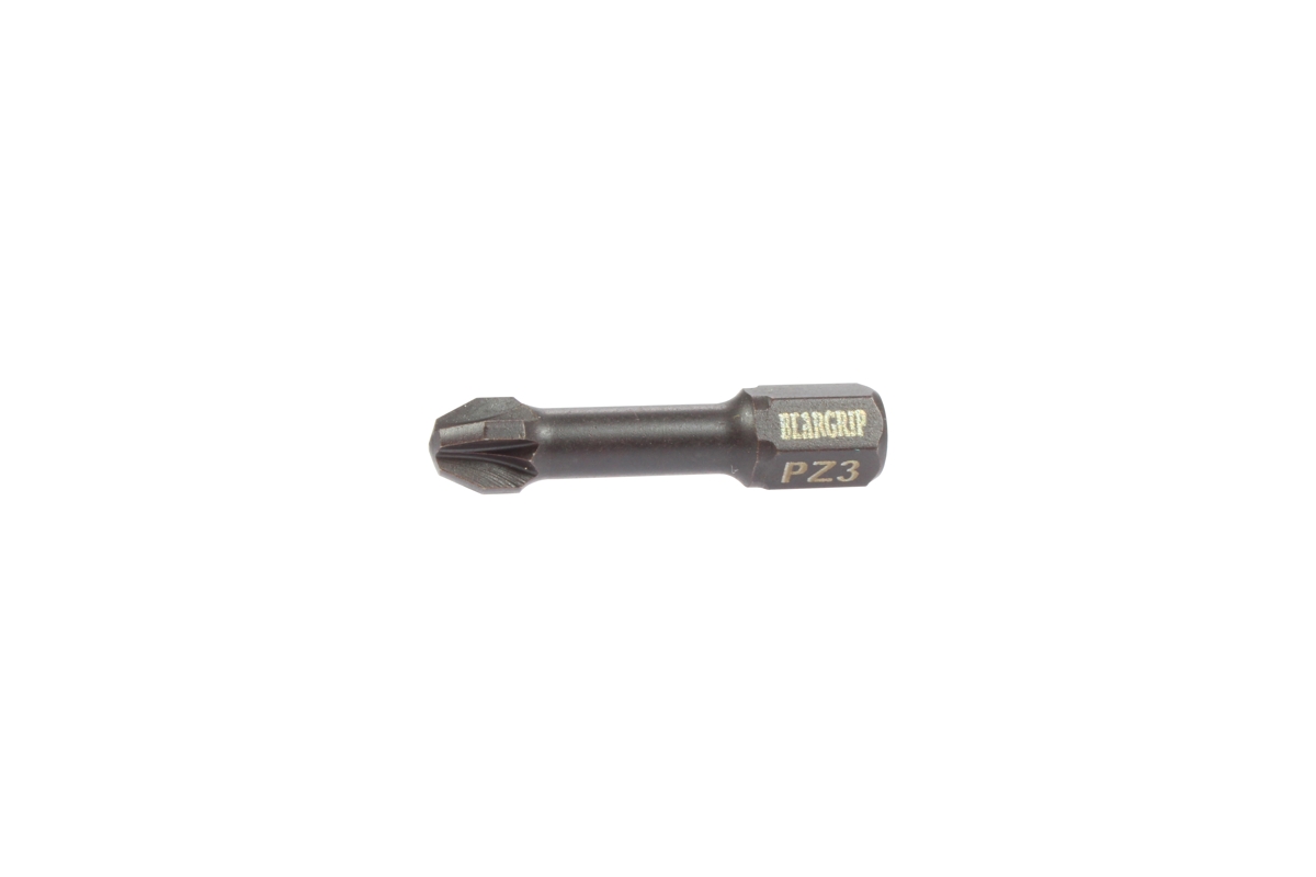 Houževnaté provedení bitů s torzním tvarem. Torzní tvar zabezpečuje předčasné opotřebení bitu. Bit je zvláště vhodný na šroubové spoje tvrdých materiálů, jako je plech, kovové díly atd. Hrot bitu je vyroben technologií rotačního kování za studena, přičemž profil bitu je tvarován údery malých kladívek rotují kolem osy bitu. Při této technologii dochází k zhutnění materiálu v místě špičky bitu a nedochází k porušení vláknité struktury kovu jako při standardní třískové výrobě na CNC obráběcích strojích, kde dochází k redukci materiálu a zeslabení špičky bitu. *speciálně zakalený dřík*vhodný pro pneumatické a elektrické nářadí *upínací část bitu je šestihran 1/4" dle normy ISO 1173 *torzní provedení *profil bitu křížový Pozidrive - PZ3*délka 30 mm