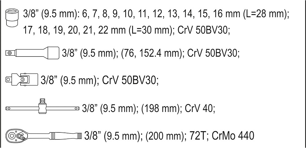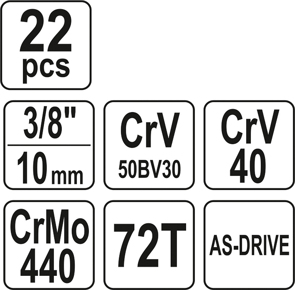 Gola set 3/8 "contains 22 pcs: attachments, extensions, articulated attachment, ratchet with plastic handle, and t-beam. Made of high-quality chrome-vanadium steel CrV6140 and CrV50BV30, S2 with AS-DRIVE function.