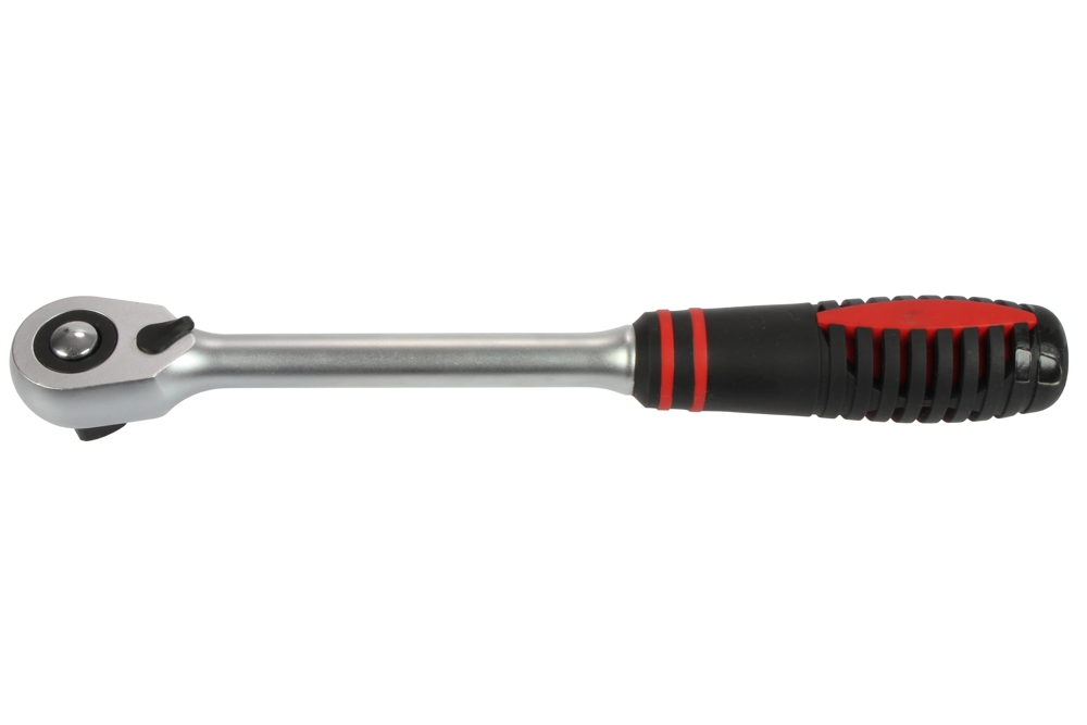 Ráčna je vyrobena z tvrzené Chrom - Vanadiové oceli, opatřena protiskluzovou dvoukomponentní rukojetí, zajišťujícím lepší manipulaci při práci. Povrchově upravená tvrdochromem pro vyšší povrchovou tvrdost a odolnost vůči korozivním vlivům. Ráčna s extra malou hlavou pro lepší dostupnost a manipulaci v těžko přístupných místech. *přepínání L/P chod přepínací páčkou *rohatka opatřena 72 zuby, citlivost chodu zubů 5° *vyhazovací tlačítko pro snadné uvolnění a výměnu hlavic *čtyřhran pro 1/2" hlavice *celková délka 255 mm