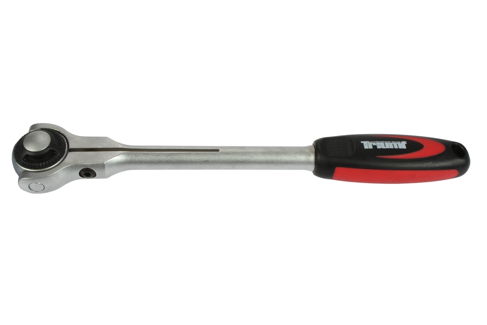 Ráčna je vyrobena z tvrzené Chrom - Vanadiové oceli, opatřena protiskluzovou dvoukomponentní rukojetí, zajišťujícím lepší manipulaci při práci. Povrchově upravená tvrdochromem pro vyšší povrchovou tvrdost a odolnost vůči korozivním vlivům. Vhodné pro práce v těžko přístupných místech. Díky patentovanému výkyvnému systému je ráčnová hlava stále v ose s tělem a rukojetí ráčny.*přepínání L/P chod přepínacím kolečkem *rohatka opatřena 72 zuby, citlivost chodu zubů 5° *vyhazovací tlačítko pro snadné uvolnění a výměnu hlavic *čtyřhran pro 3/8" hlavice *celková délka 235 mm *max. zatížení 210 Nm