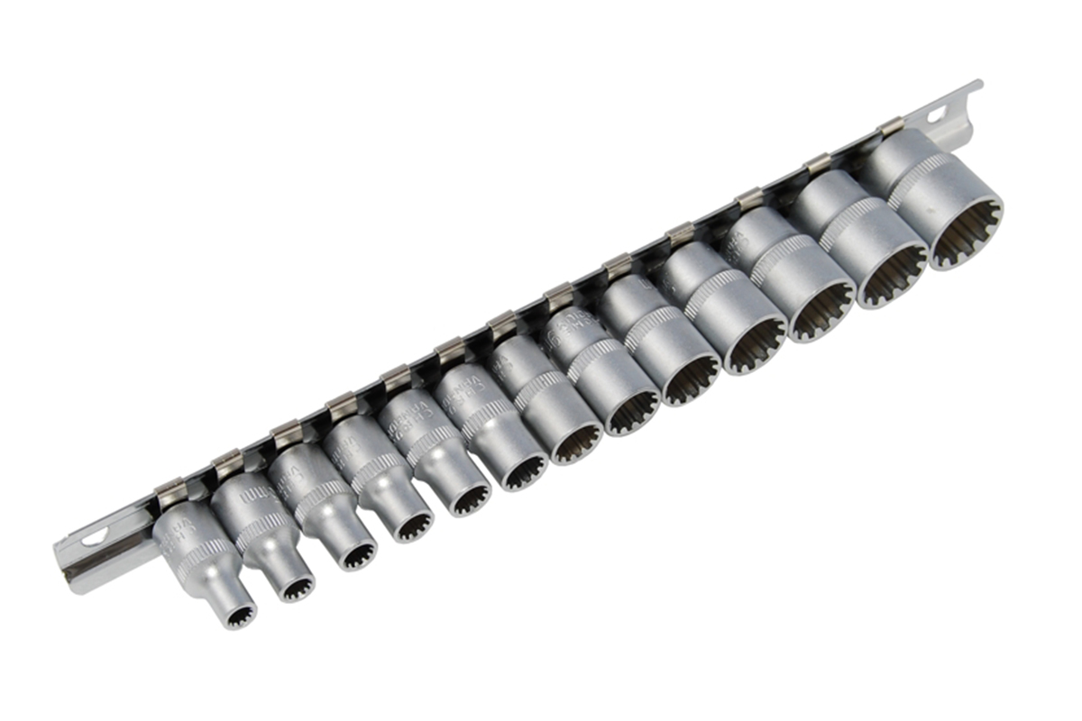 Hlavice jsou vyrobeny z kalené Chrom - Vanadiové oceli a povrchově upravené chromem pro vyšší povrchovou tvrdost a odolnost vůči korozivním vlivům. *profil VarioPlus se speciálním 12ti hranným zaobleným tvarem hlavice je univerzální hlavice, jež umožňuje povolování a utahování čtyř hranných, E-profilových, 6ti i 12ti hranných metrických a palcových matic a šroubů *lze použít jak na nové tak i poničené matice a šrouby, protože utahovací i povolovací síla je přenášena na stěnu a ne na hranu matic a šroubů*hlavice VarioPlus jsou ideálním řešením pro výjezdové montážní a servisní pracovníky*pro ruční použití *NENÍ URČENO PRO PNEUMATICKÉ NÁŘADÍ *vstup pro 1/4" ráčnu *délka 25 mm *sada obsahuje rozměy 4 - 4,5 - 5 - 5,5 - 6 - 7 - 8 - 9 - 10 - 11 - 12 - 13 - 14 mm *na ocelové kolejnici