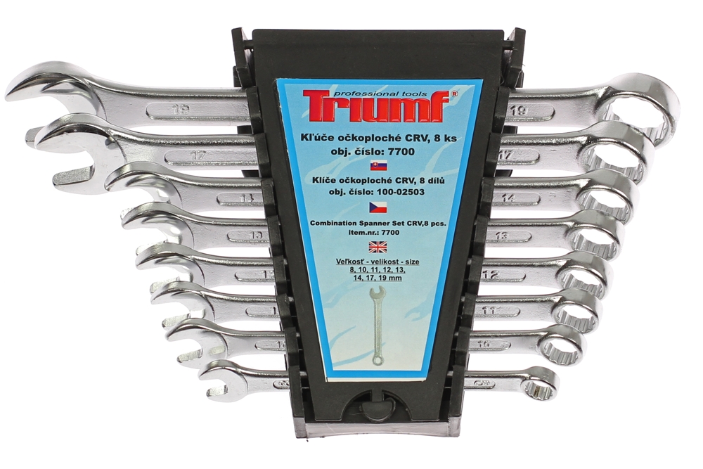 Klíče jsou vyrobeny kováním z jednoho kusu jakostní legované Chrom - Vanadiové oceli a povrchově upraveny chromem pro vyšší povrchovou tvrdost a odolnost vůči korozivním vlivům. Ústí klíčů je vykloněno o 15° oproti ose klíče a 12ti hranné očko je vyhnuto o 15°. Ideální pro použití v různých odvětvích průmyslu, své místo naleznou i v každé řemeslné i hobby dílně. *vyrobeno dle normy DIN 3113 *sada obsahuje klíče rozměrů 8 - 10 - 11 - 12 - 13 - 14 - 17 - 19 mm *dodáváno v plastovém pořadači
