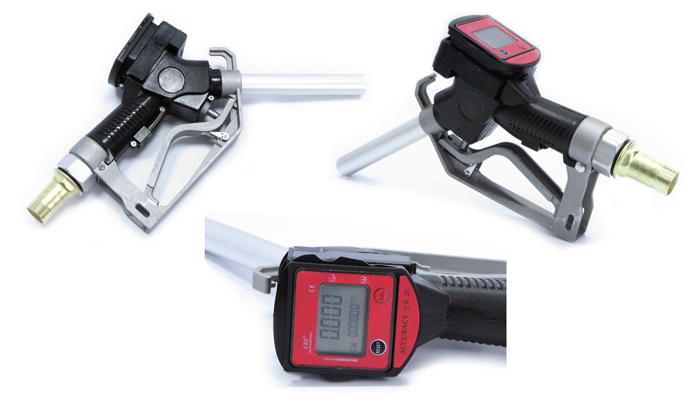 Moderní čerpací pistole vybavená elektronickým průtokoměrem (s přesností +/- 0,2%) určená pro nízkoviskozní kapaliny a použití v: