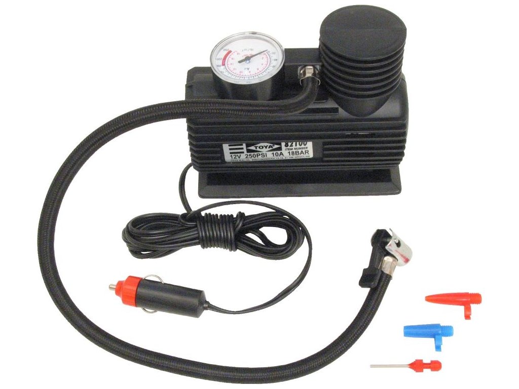 doplňující parametr: manometr 250PSI/1,7MPa, délka napájecího kabelu 3m,připojení do autozásuvky 12V, vzduchová hadička 0,5m, 3 typy koncovek, CE