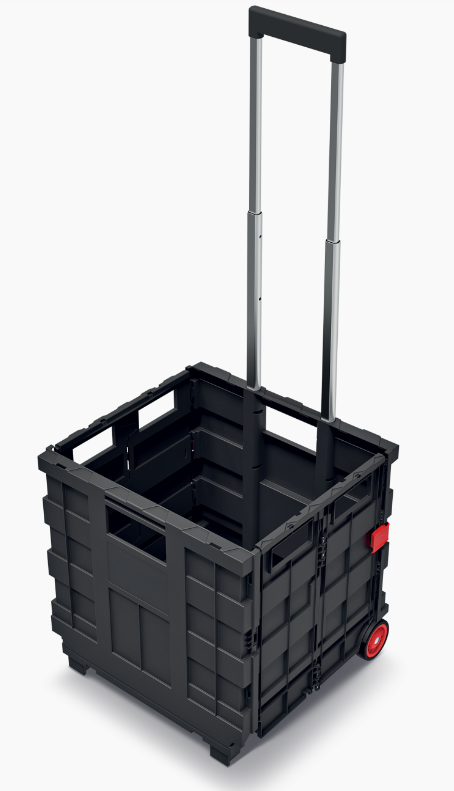 Přepravní skládací box. Umožňuje snadnou přepravu různých předmětů o celkové hmotnosti nepřesahující 25 kg . Ve složeném stavu zabírá box málo místa, takže jej lze uložit například do kufru auta. Vybaven teleskopickou rukojetí.