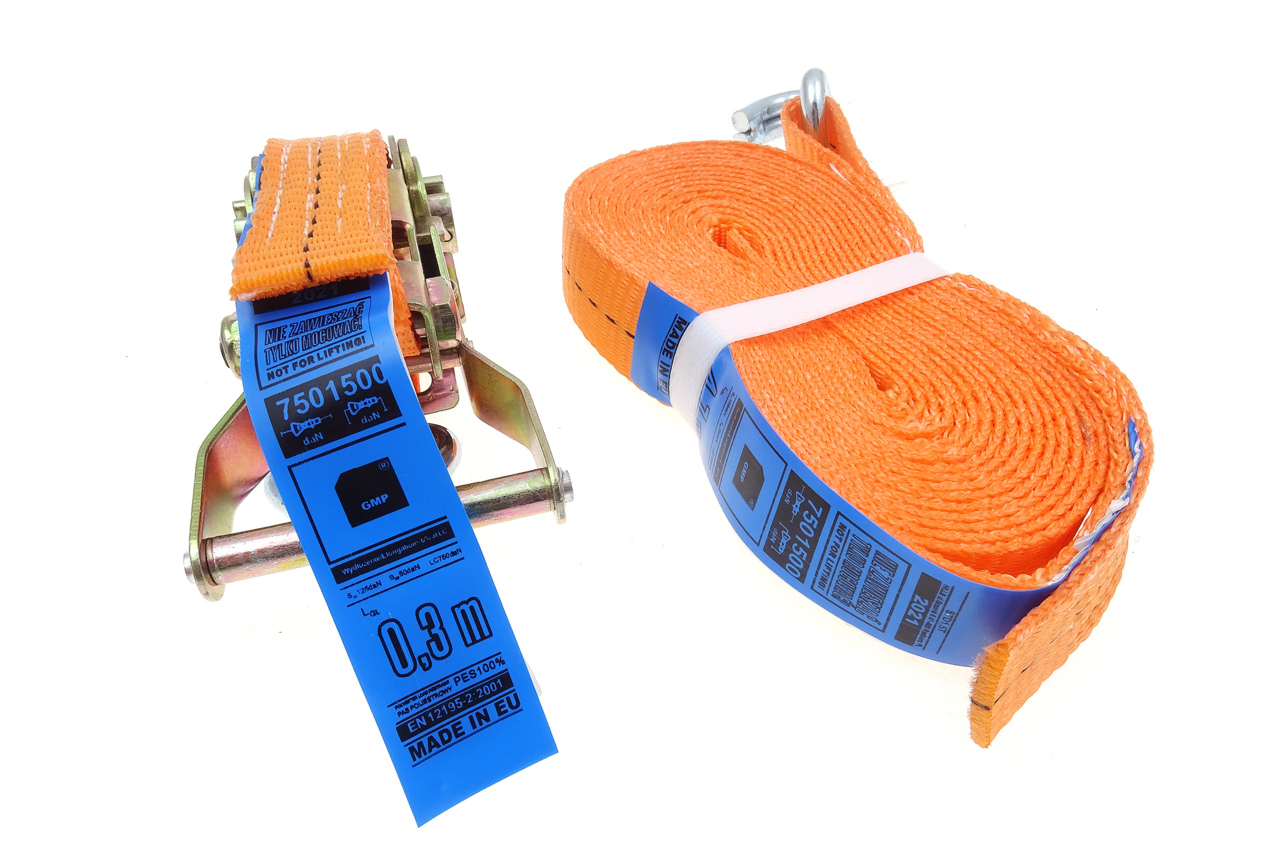 Upínací pás s ráčnou a kovovými háky, tzv. kurtna (kurta), dvoudílný, vázací síla 1500 kg, celková délka 500 cm – GMP
