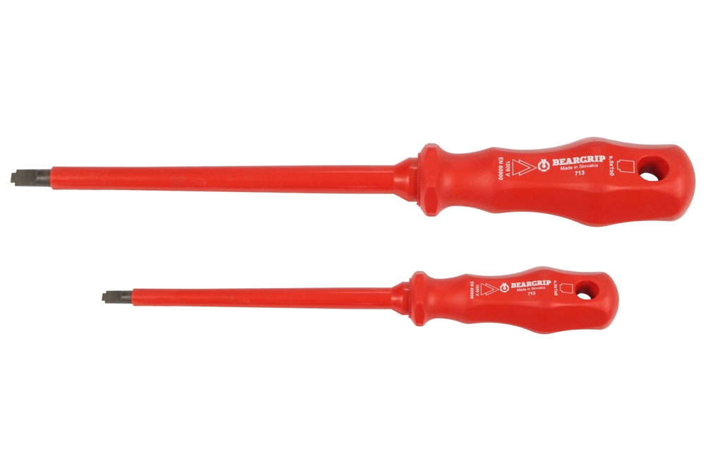 Dříkyšroubováků jsou vyrobeny z jakostní legované 58 CRV4 oceli. Ergonomická jednokomponentní rukojeť je vstřikována přímo na dřík pro vysokou odolnost a pevnost. Tvar hrotu plochý terminál je určen pro šrouby elektro svorkovnic a jističů.*hrot kalený, černěný *jednokomponentní červená rukojeť s otvorem pro zavěšení a s ochrannými prvky proti odkutálení *tvar hrotu Terminál PL, kulatý dřík šroubováku *sada obsahuje:*šroubovák plochý terminál 3,5 x 100 mm, VDE do 1000 V, 713 *šroubovák plochý terminál 6,5 x 150 mm, VDE do 1000 V, 713 *šroubováky jsou zkoušeny proti elektrickému průrazu podle normy EN 60900