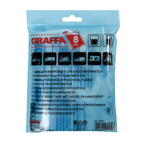Nouzový kanystr GIRAFFA je vždy připraven k použití. Zabere minimum místa a může být skladován kdekoliv. Vhodný pro opakované použití. Snadno uzavíratelný díky klipu. Při použití pro přenášení benzínu, nafty, nebo jiných hořlavin je povoleno pouze dočasné nouzové použití. Technický popis: Kapacita: 8l Opakovaně použitelný Skladný snadno uzavíratelný díky klipu Upozornění: Neschváleno pro skladování a přepravu hořlavin