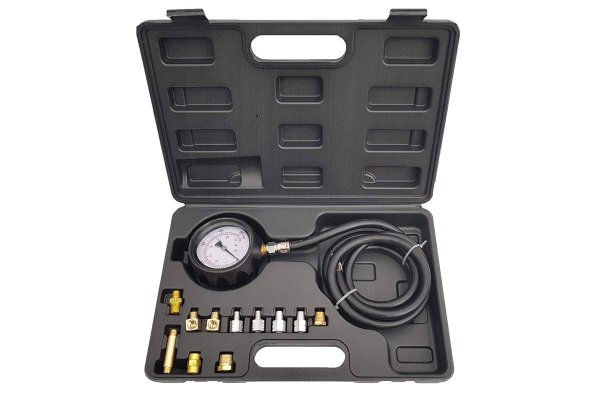 Tester tlaku oleje je možné použít pro benzínové i dieselové motory*pomocí 10 ks koncovek místo snímače tlaku oleje na motoru je měřen tlak mazání v rozsahu 0 - 10 bar*součástí manometru je hadice s délkou 1 m s rychlospojkou*v balení je též úhlový nástavec a náhradní těsnící podložky*dodáváno v PVC kazetě