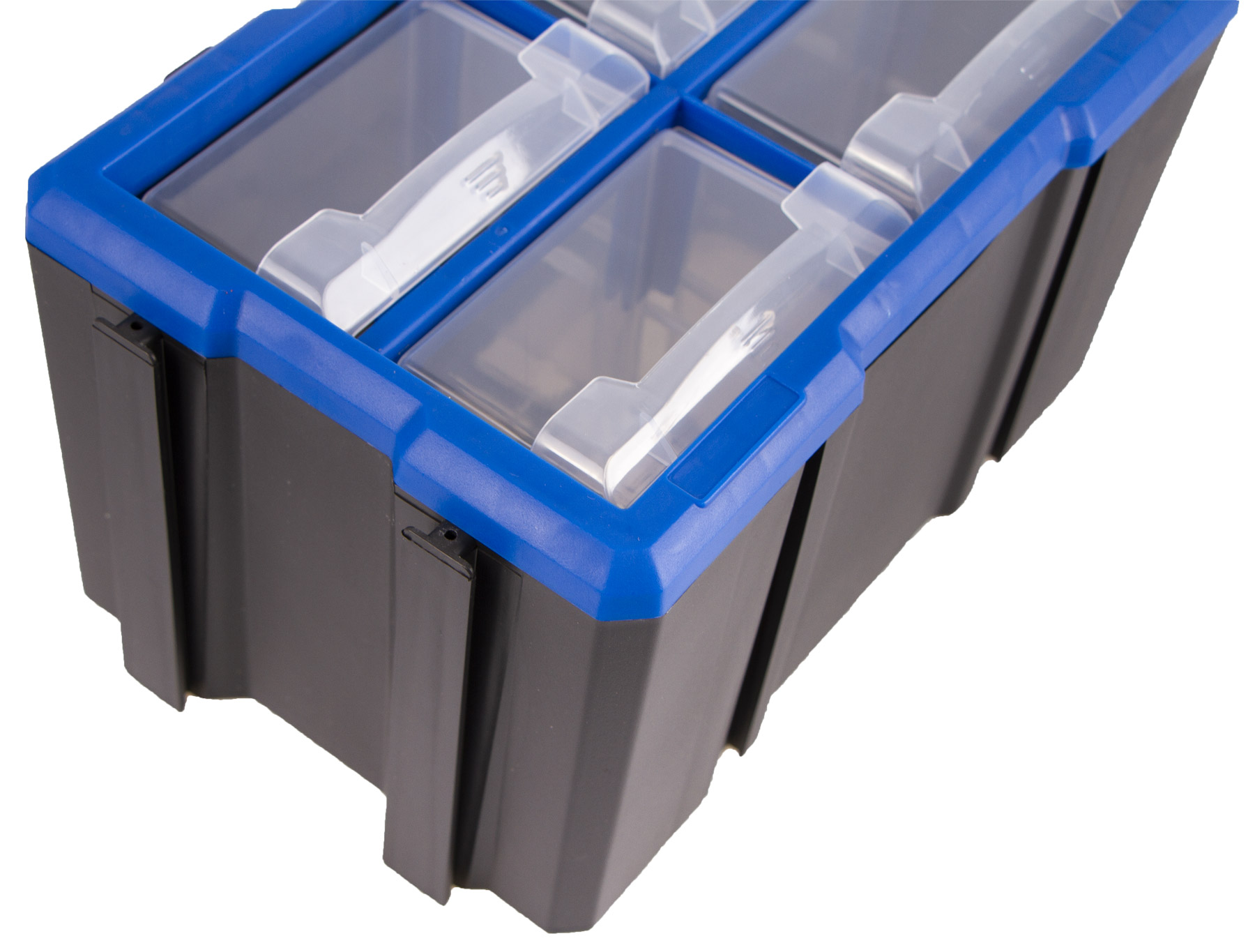 Plastový organizér se 4-mi středně velkými průhlednými boxy, vhodný např. pro uskladnění a přehledné rozdělení šroubků, matic a dalšího nářadí, které by se mohlo zakutálet a ztratit. Každý box má jednu přepážku, kterou můžete vyndat, takže si u každého boxíku můžete vybrat, jestli chcete jedno nebo dvě skladovací místa.