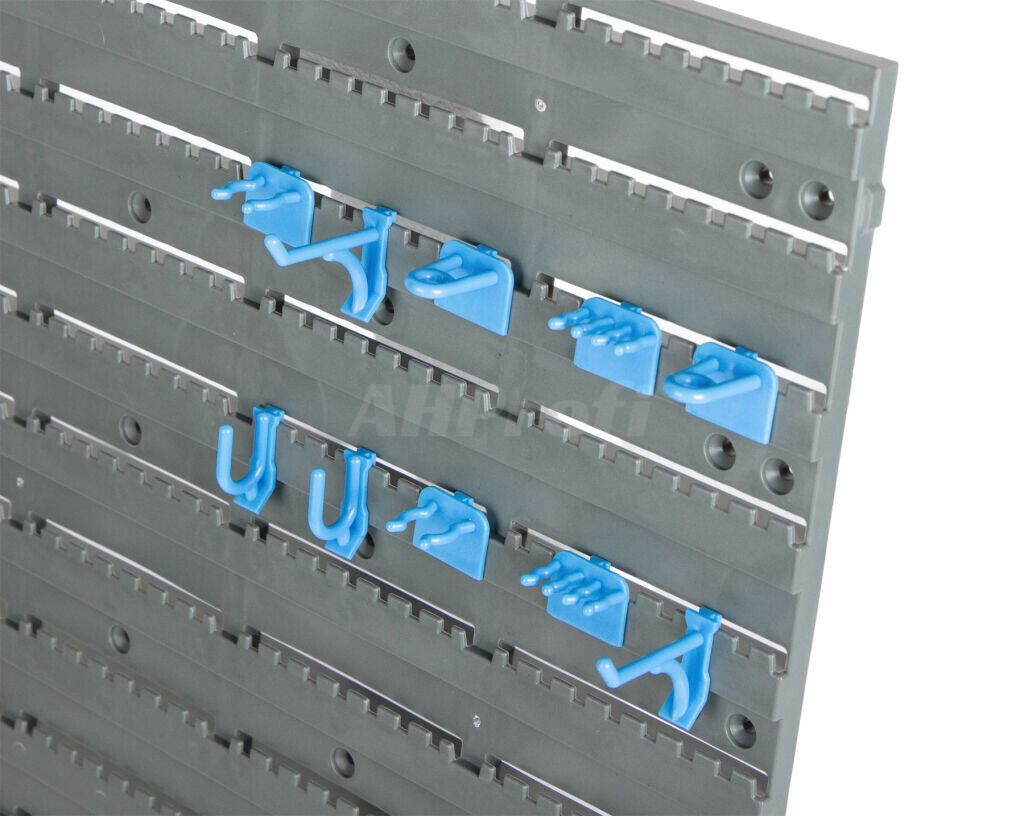 Plastová děrovaná deska s přípravou pro uchycení na stěnu.