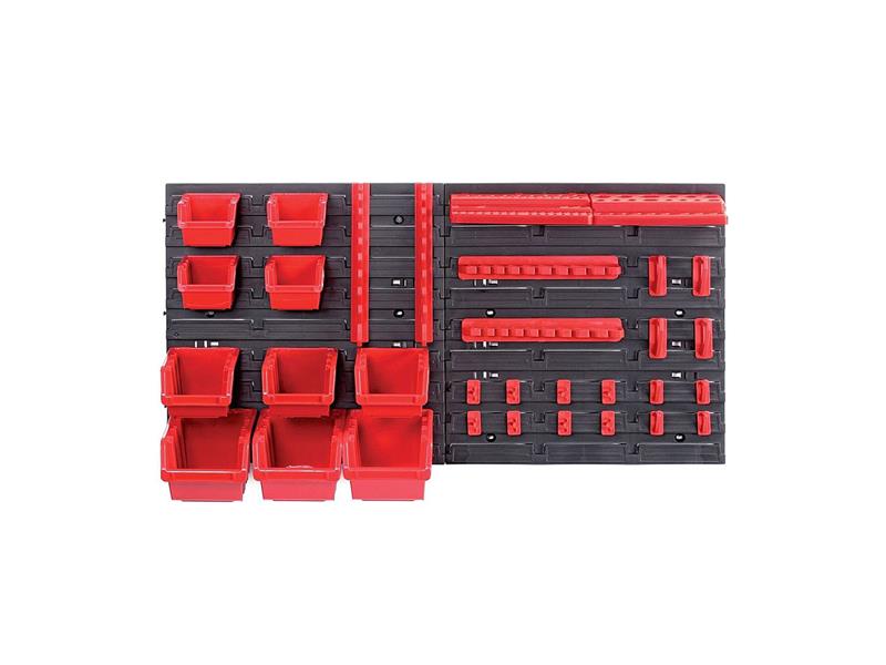 Stěna na nářadí Technické parametry:- Rozměry: 800x165x400 mm- Hmotnost: 1449 g Set obsahuje:- 2x závěsný panel KBBS40-S411- 4x box KTR4-3020- 3x box KTR6-3020- 3x box KTR8-3020- 22x háčky a police (KBS20 + KBH20)
