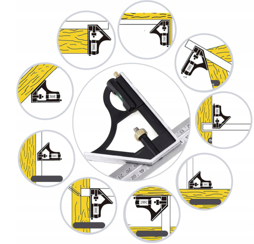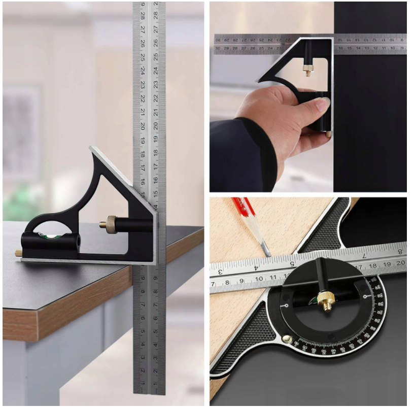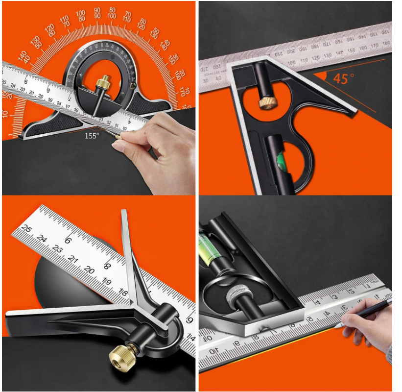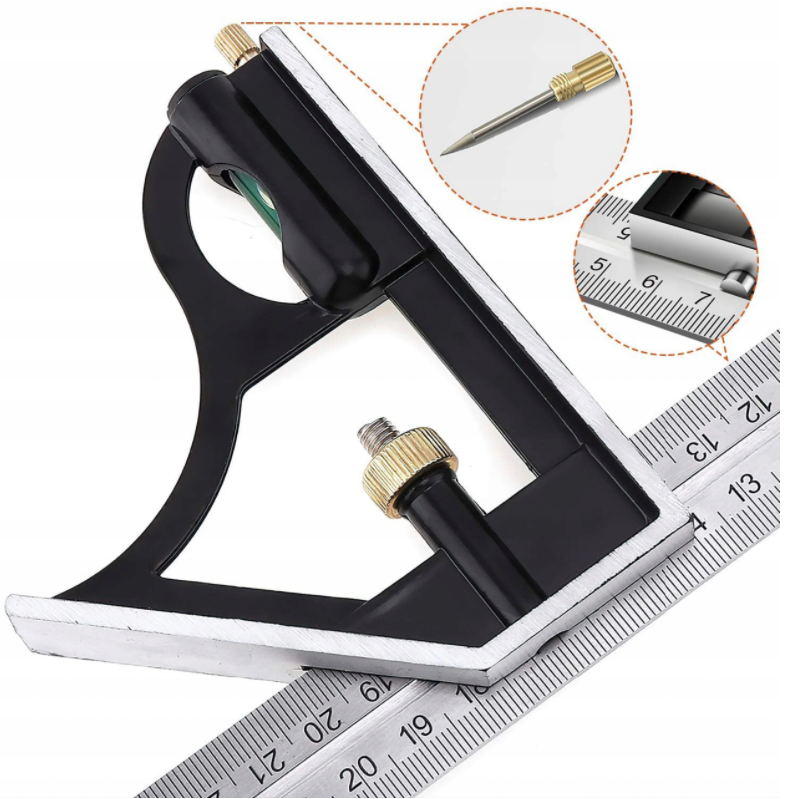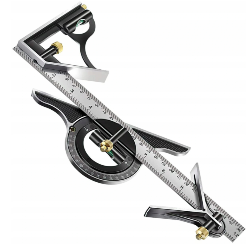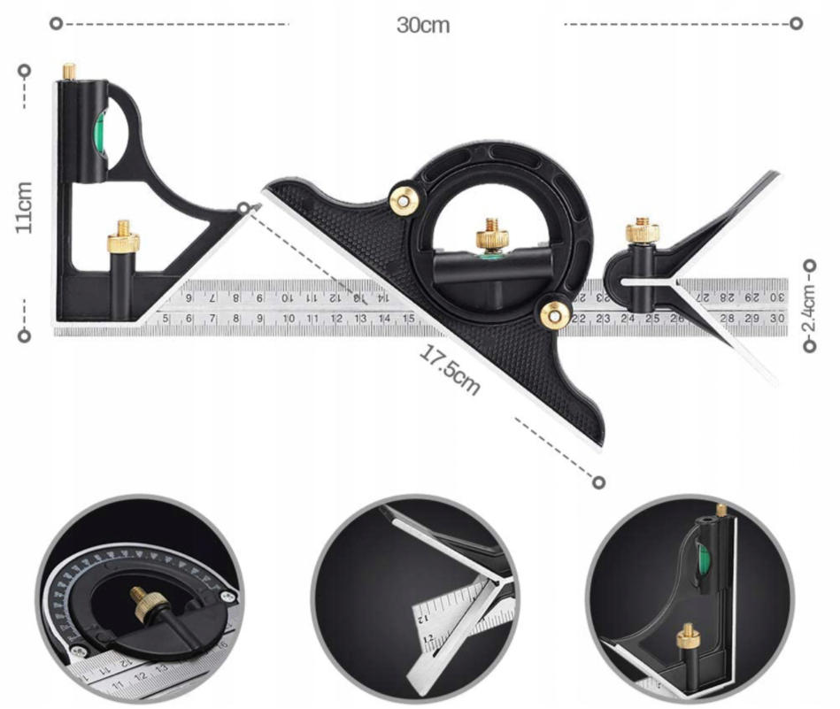 multifunkční úhelník se třemi nástavci (úhloměr s vodováhou, úhelník či pomůcku pro odměření 45°)