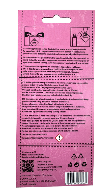 Přineste do svého automobilu nebo domácnosti nádech luxusu s naší originální vůní do auta Aroma Leather Cat Lavender & Peppermint vyrobenou z pravé hovězí kůže. Tento designový osvěžovač je nejen účinný, ale také stylový doplněk, který zaujme každého, kdo hledá kvalitu a dlouhotrvající vůni. Vůně je napuštěna směsí přírodních, esenciálních olejů, které příjemně provoní vaše auto, byt nebo kancelář. Díky své univerzálnosti ji můžete zavěsit kamkoliv, nebo ji umístit na jiné místo v interiéru. Po vyprchání původní vůně stačí na kůži nastříkat libovolný parfém a osvěžovač můžete používat znovu a znovu. Tento produkt nabízí praktické a dlouhotrvající řešení pro všechny, kteří si potrpí na kvalitu a design. Svěžest, která nezmizí – vůně v tomto koženém osvěžovači vydrží dlouhou dobu, ať už v autě, na stole nebo v jiném prostoru. Navíc si můžete zvolit jakýkoliv parfém, který vám nejvíce vyhovuje. Profil vůně: Levandule pro navození uklidňující a relaxační atmosféry. Máta peprná pro osvěžení a nabuzení ducha a lepší soustředění. Klíčové vlastnosti: Vyrobeno z pravé hovězí kůže v České Republice Napuštěno směsí přírodních, esenciálních olejů Možnost opakovaného použití – stačí nastříkat nový parfém Moderní a elegantní design Užijte si trvalou svěžest a styl s naším exkluzivním koženým osvěžovačem vůní. Luxusní parfém s unikátním profilem vůně Možnost opakovaného použití – jednoduše nastříkejte nový parfém Ideální pro zavěšení do auta nebo použití v domácnosti Užijte si nezaměnitelnou vůni, která přináší nejen svěžest, ale i pocit luxusu do vašeho každodenního života. Aroma Aroma Leather Cat Lavender & Peppermint je symbolem elegance, kvalitního zpracování a nekonečných možností. Průmyslový design a provedení chráněno společností CAPPA 2 s.r.o. (2024-42300, číslo zápisu:38236)