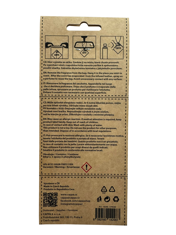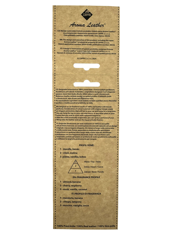 Přineste do svého automobilu nebo domácnosti nádech luxusu s naší originální vůní do auta Aroma Leather Tree Cherry vyrobenou z pravé hovězí kůže. Tento designový osvěžovač je nejen účinný, ale také stylový doplněk, který zaujme každého, kdo hledá kvalitu a dlouhotrvající vůni. Vůně je napuštěna prémiovým francouzským parfémem, který příjemně provoní vaše auto, byt nebo kancelář. Díky své univerzálnosti ji můžete zavěsit kamkoliv, nebo ji umístit na jiné místo v interiéru. Po vyprchání původní vůně stačí na kůži nastříkat libovolný parfém a osvěžovač můžete používat znovu a znovu. Tento produkt nabízí praktické a dlouhotrvající řešení pro všechny, kteří si potrpí na kvalitu a design. Svěžest, která nezmizí – vůně v tomto koženém osvěžovači vydrží dlouhou dobu, ať už v autě, na stole nebo v jiném prostoru. Navíc si můžete zvolit jakýkoliv parfém, který vám nejvíce vyhovuje. Profil vůně: Hlava: Mandle – sladká, jemná a lehce ořechová vůně, která přináší pocit hřejivého pohodlí a pohody. Banán – ovocná, krémová a jemně nasládlá vůně, která dodává svěžest a exotický nádech. Srdce: Višeň – ovocná a lehce kyselá vůně, která je osvěžující a zároveň vysoce aromatická, vytvářející bohatý a živý dojem. Malina – sladká a šťavnatá, její svěží tóny dokonale doplňují višni a dodávají vůni hravost a ovocnou sladkost. Základ: Pižmo – smyslné a teplé, dodává hloubku a dlouhotrvající vjem vůně. Vanilka – bohatá, krémová a jemně sladká, přidává vůni hřejivost a elegantní dotek. Kokos – exotická, krémová a sladká vůně, která uzavírá celkový dojem a přináší pocit tropického ráje. Klíčové vlastnosti: Vyrobeno z pravé hovězí kůže v České Republice Napuštěno francouzským parfémem Možnost opakovaného použití – stačí nastříkat nový parfém Moderní a elegantní design Užijte si trvalou svěžest a styl s naším exkluzivním koženým osvěžovačem vůní. Luxusní francouzský parfém s unikátním profilem vůně: mandle, banán, višeň, malina, vanilka, kokos a pižmo Možnost opakovaného použití – jednoduše nastříkejte nový parfém Ideální pro zavěšení do auta nebo použití v domácnosti Užijte si nezaměnitelnou vůni, která přináší nejen svěžest, ale i pocit luxusu do vašeho každodenního života. Aroma Leather Tree Cherry je symbolem elegance, kvalitního zpracování a nekonečných možností. Průmyslový design a provedení chráněno společností CAPPA 2 s.r.o. (2024-42300, číslo zápisu:38236)