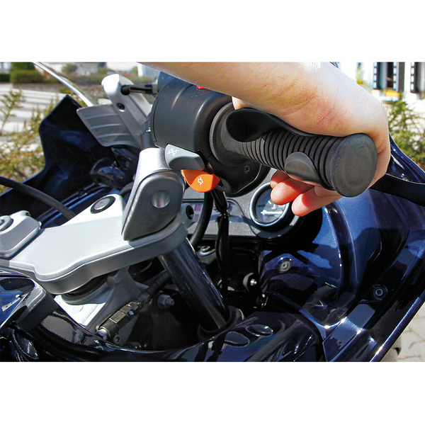 Ideální pomůcka na dlouhé jízdy na motorce, skůtru, apod. Tempomat se jednoduše nasadí na rukojeti a opřením ruky snadno docílíte plynulé jízdy. Po celou dobu jízdy nemusíte tlačit silou na rukojeť plynu a odpadá tak bolest v zápěstí. TECHNICKÝ POPIS: Univerzální tempomat / opěrka pro zápěstí Materiál: ABS plast Hmotnost: 45 g Pro rukojeti o průměru: 31 - 35 mm
