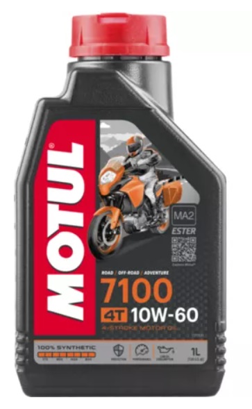 MOTUL 7100 4T 10W-60 je syntetické, čtyřtaktní mazivo, vyvinuté na bázi esterů. Splňuje požadavky výrobců, hlavně KTM, HUSQVARNA, MV Agusta, a MOTO GUZZI, kteří doporučují SAE 10W60. Excelentní smyková únosnost, chránící motor a převodovku. Hladké řazení. Vyhovuje specifikacím JASO MA2, pro optimální výkon mokré spojky. Vhodné i pro katalyzátory.