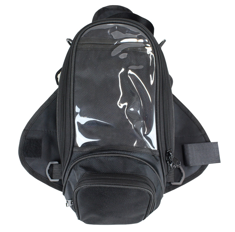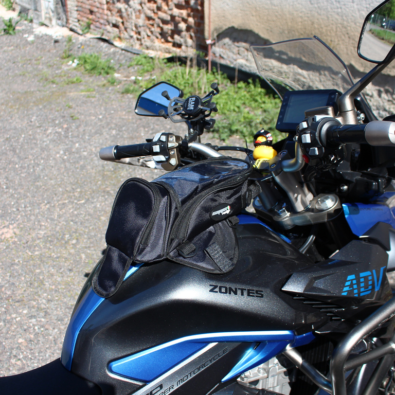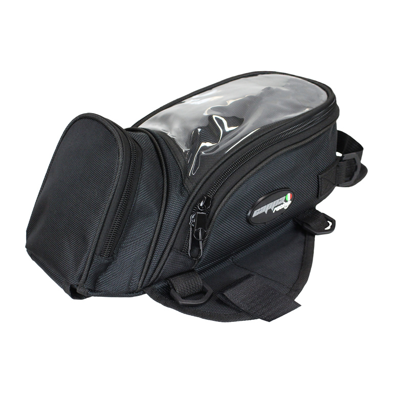 Brašna s magetickým či popruhovým uchycením na nádrž motocyklu. Protiskluzová základna se čtyřmi magnety zajistí spolehlivé uchycení. Odolný materiál polyester 600D s PU podšívkou v kombinaci s nepromokavým potahem umožní použití brašny i na přímém dešti a zajistí ochranu před UV zářením. Brašna je zároveň dodávána s pláštěnkou pro její překryt a nosnou rukojetí pro nošení po sesednutí. Brašnu je možno pomocí 6ti D kroužků připevnit k nekovovým nádržím (popruhy nejsou součástí balení). ROZMĚRY: Šířka: 32 cm Výška: 12 cm Hloubka: 20 cm TECHNICKÝ POPIS: Materiál: Polyester 600D Uchycení: 4 magnety / popruhy Objem: 3l Vrchní průhledná kapsa na mobil, mapu, doklady apod. Nepromokavý obal a nosný popruh součástí balení Rozměry magnetické plochy: 34 × 49 cm