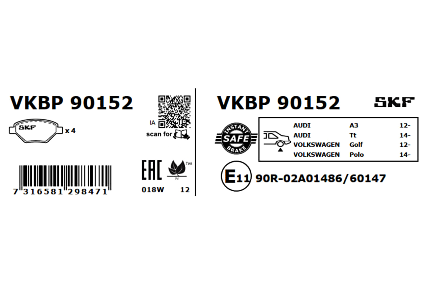 SKF VKBP 90152 - Sada brzdových destiček, vždy 4 kusy v sadě
