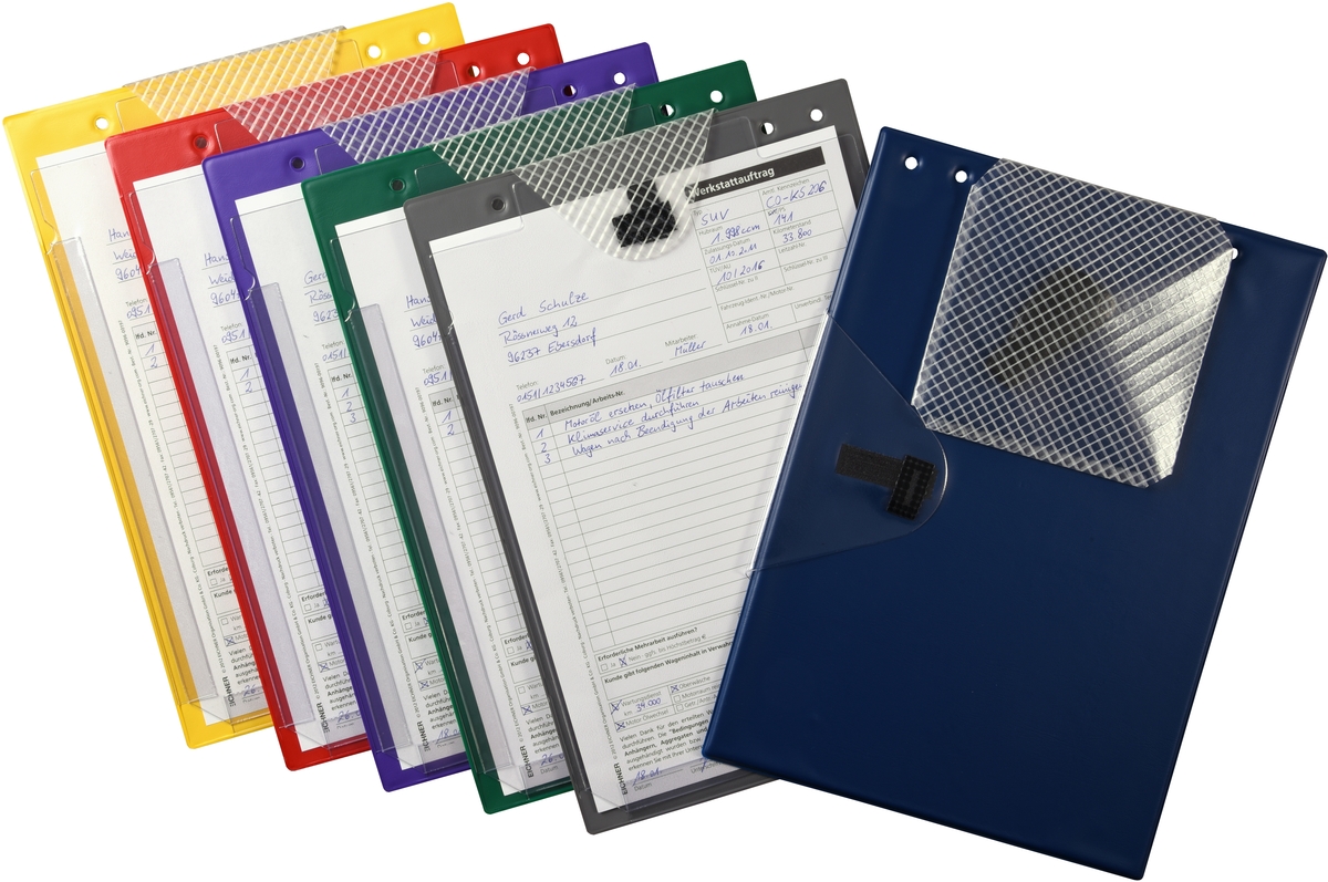 Desky na zakázkové dokumenty (A4) s velkou průhlednou přední kapsou, se suchým zipem nahoře a také s přídavným bočním uzávěrem, s poutkem a se zadní kapsou na klíče, v různých barvách.