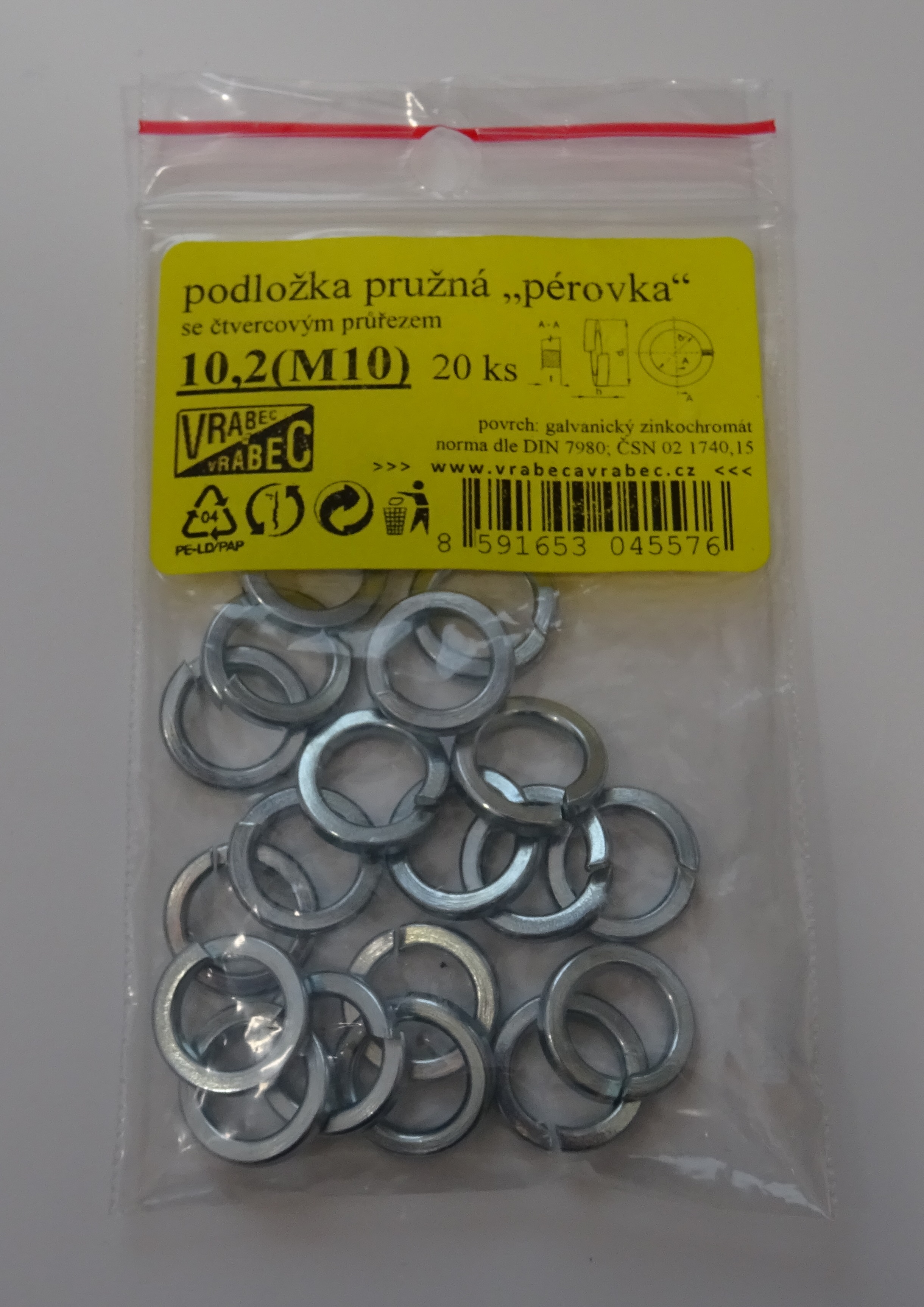 Prodej pružných podložek podle normy DIN 7980 Zn, tzv. "pérovek"Vybírat můžete z rozměrů:M5: vnější průměr 8,8 mm, průřez 1,6 mm, výška pérka 3,2 mm, pro závit průměru 5 mm.M6: vnější průměr 9,9 mm, průřez 1,6 mm, výška pérka 3,2 mm, pro závit průměru 6 mm.M8: vnější průměr 12,7 mm, průřez 2 mm, výška pérka 4 mm, pro závit průměru 8 mm.M10: vnější průměr 16 mm, průřez 2,5 mm, výška pérka 5 mm, pro závit průměru 10 mm.M12: vnější průměr 18 mm, průřez 2,5 mm, výška pérka 5 mm, pro závit průměru 12 mm.Galvanicky pozinkovaný povrch, odolný proti korozi.Balení mají různé obsahy (viz konkrétní varianta), jsou ale uzavíratelná v sáčku se zipem. Nehrozí tak vysypání podložek např. do tašky apod.