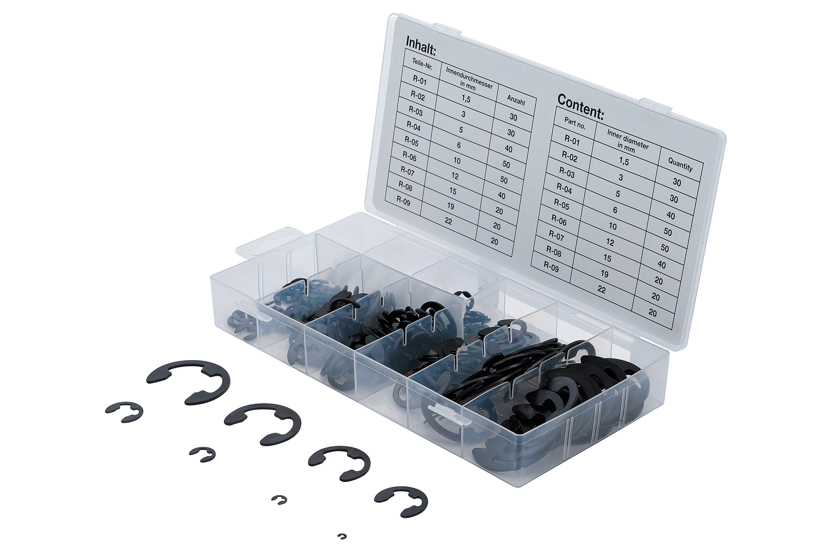 Praktická sada pojistných kroužků pro hřídele s drážkou. Celkem 300 kusů ve velikostech 1,5 až 22 mm.