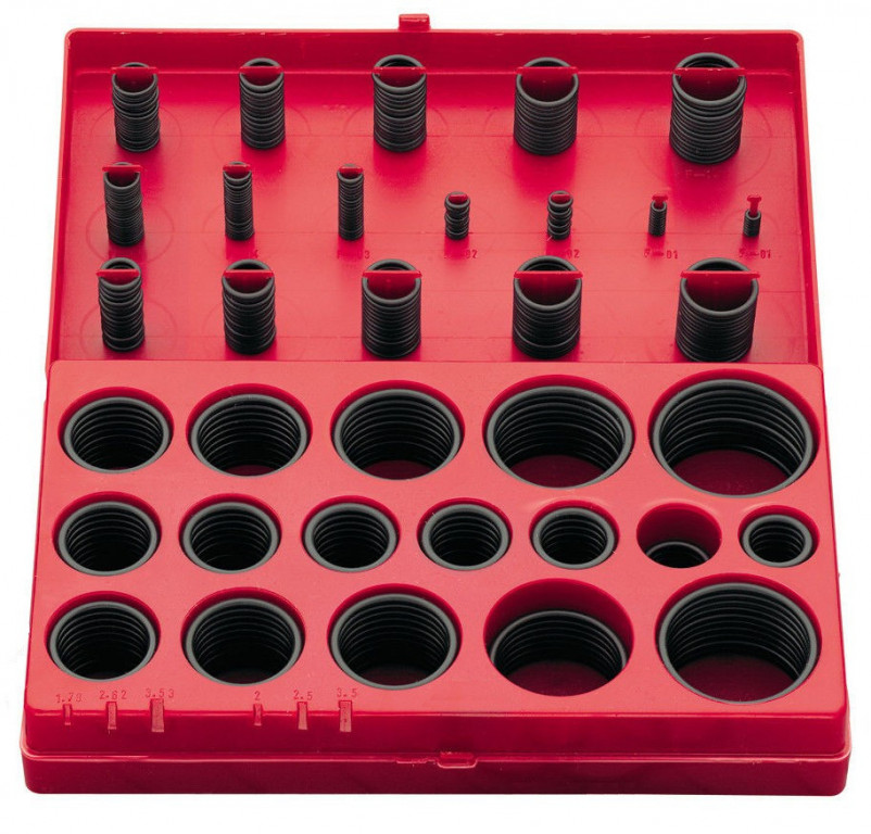 Plastový box s prolisy a háčky přehledně člení 32 nejpoužívanějších rozměrů o-kroužků z materiálu NBR. Gumová těsnění jsou v metrických mírách v rozmezí 7 až 57 mm. Materiál kroužků dosahuje tvrdosti 70 Shore A a guma NBR je odolná proti minerálním olejům, olejům, tukům a dalším látkám.