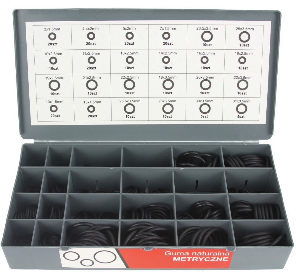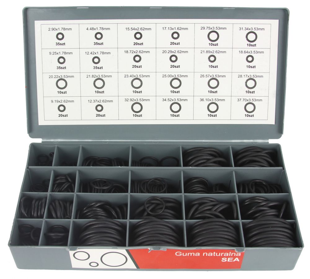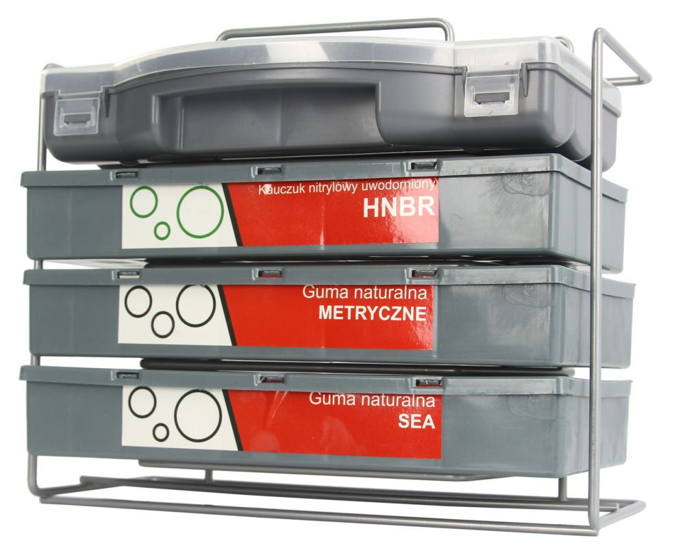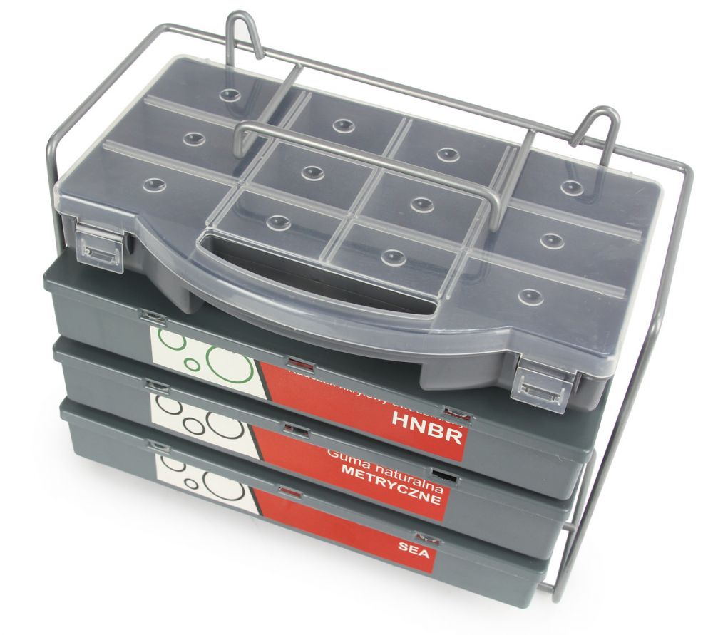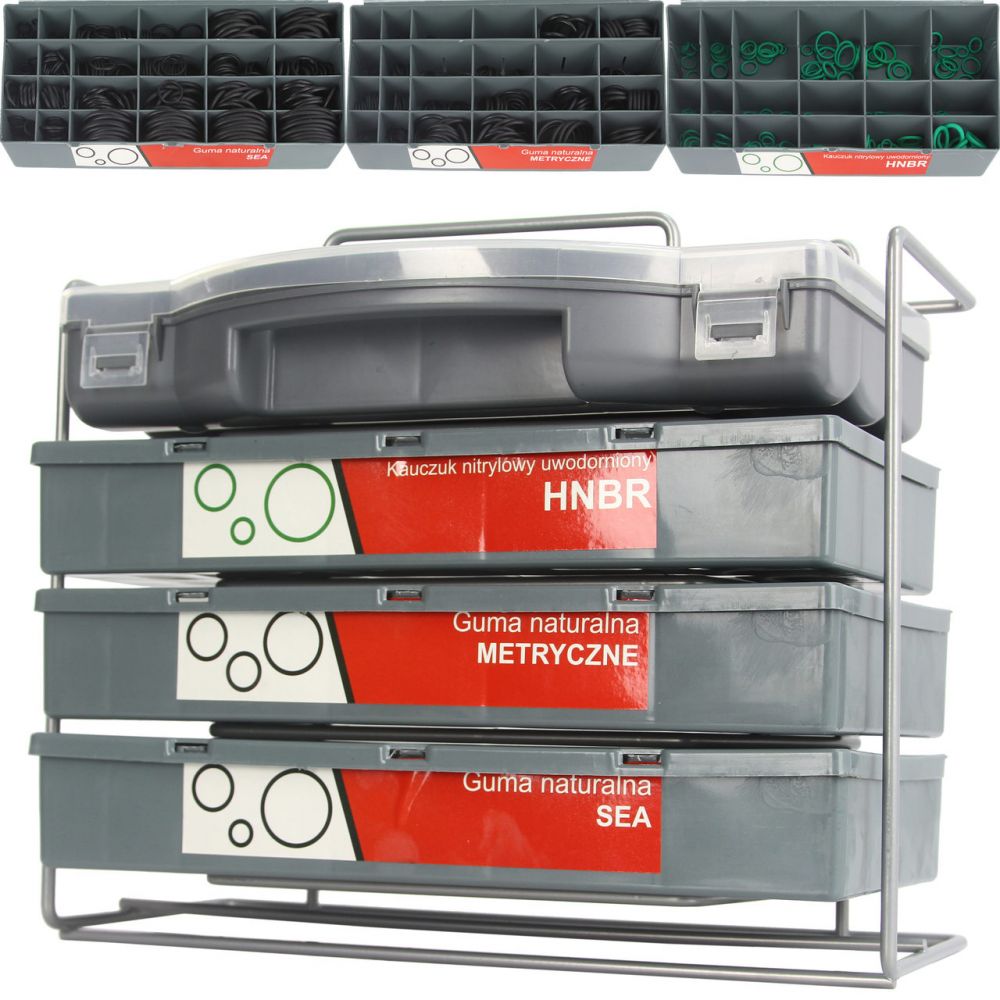 Těsnící O-kroužky HNBR, NBR (metrické a SAE) v sadě 900 ks uložené ve třech praktických kufřících umístěných ve stojanu. Součástí sady je organizér, do kterého lze uložit jen potřebná těsnění bez nutnosti přenášení celého stojanu s kufříky. Uplatnění nalezne v servisech, dílnách.