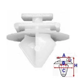 Tento díl lze objednat pouze po 10 kusech. rozměry: A = 9,9mm - B = 8,1mm - C = 20,3mm - d = 1,7mm - H = 15,8mmbalení obsahuje: 10 kspopis: příchytka se zasouvací hlavouumístění příchytky: exteriéraplikace: dveřeaplikace: Fiat, Peugeot