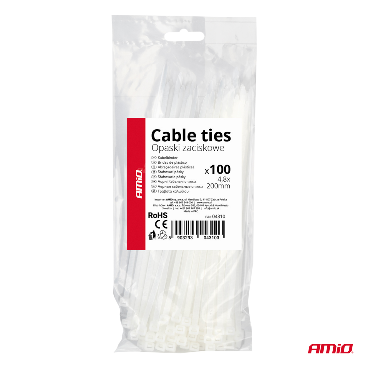 Amio 04310 - Plastové stahovací pásky, bílé 4,8x200mm 100ks AMiO-
