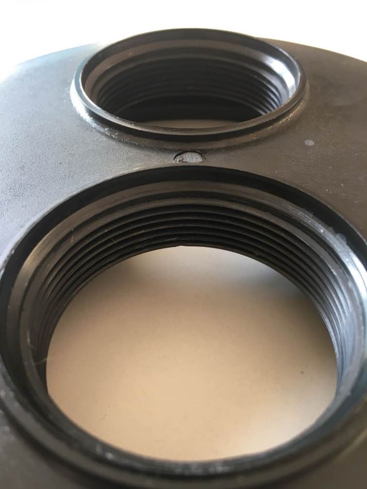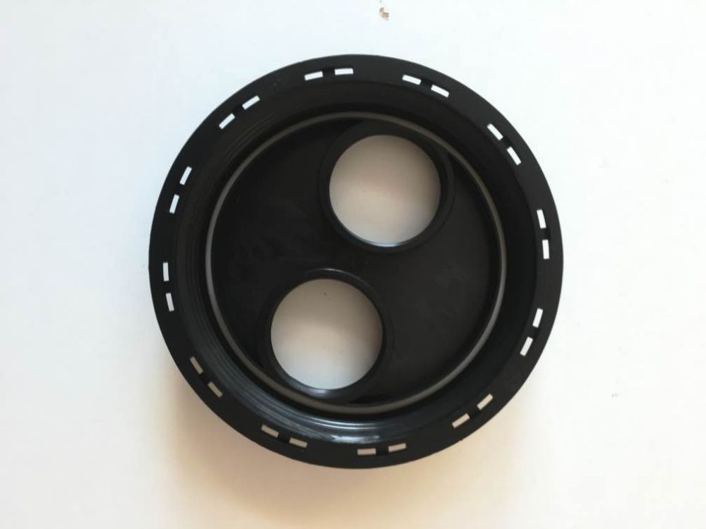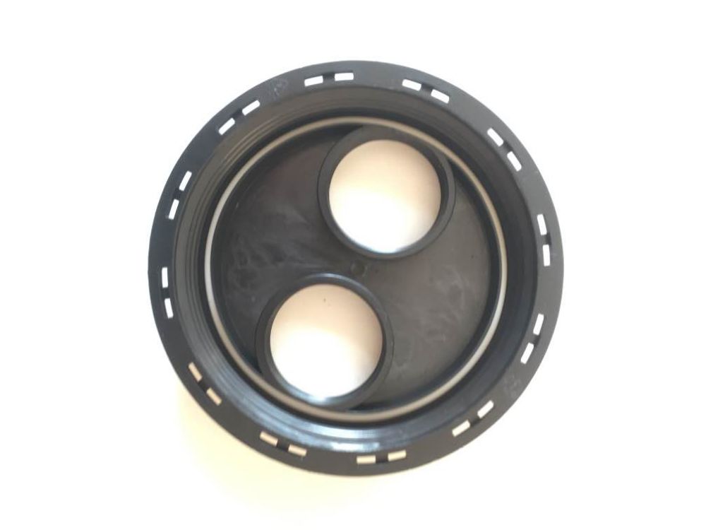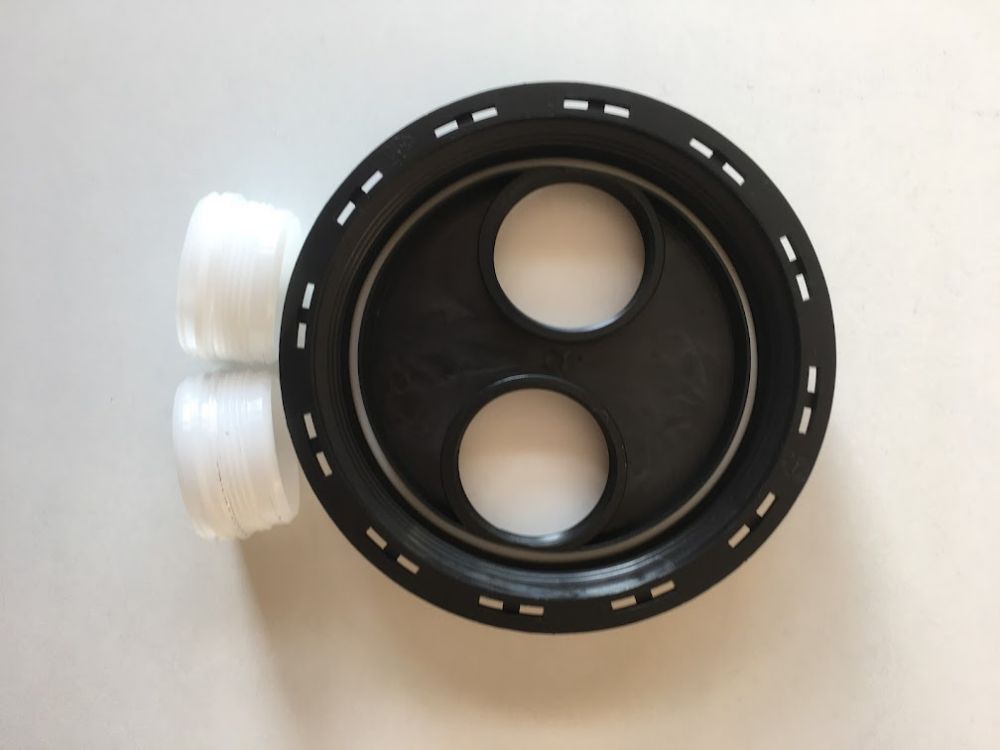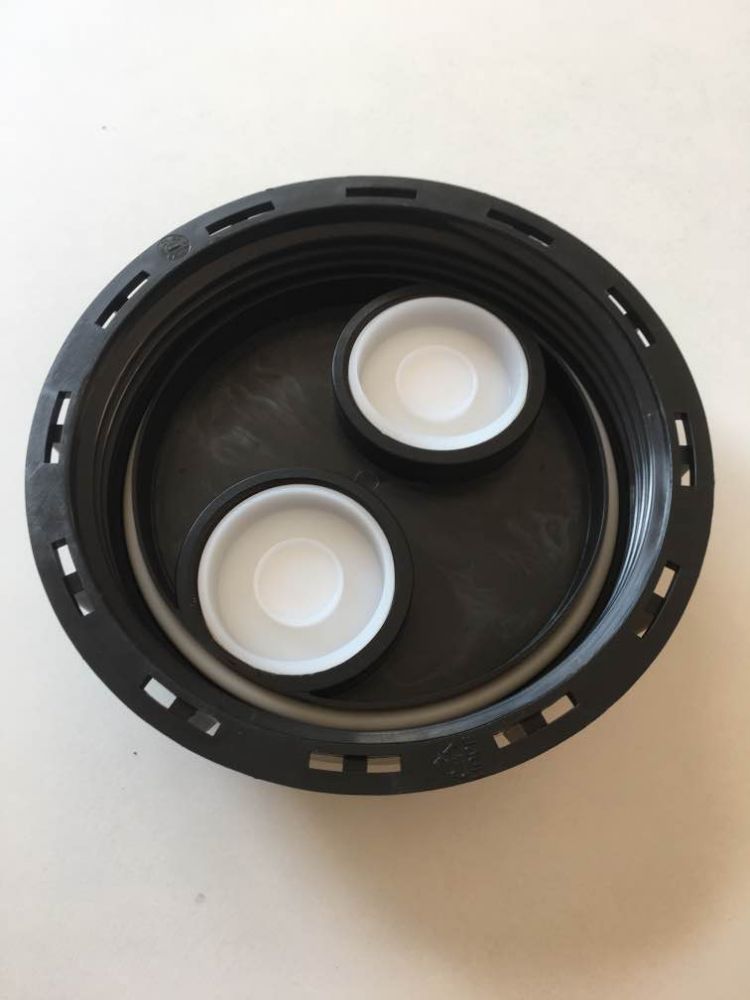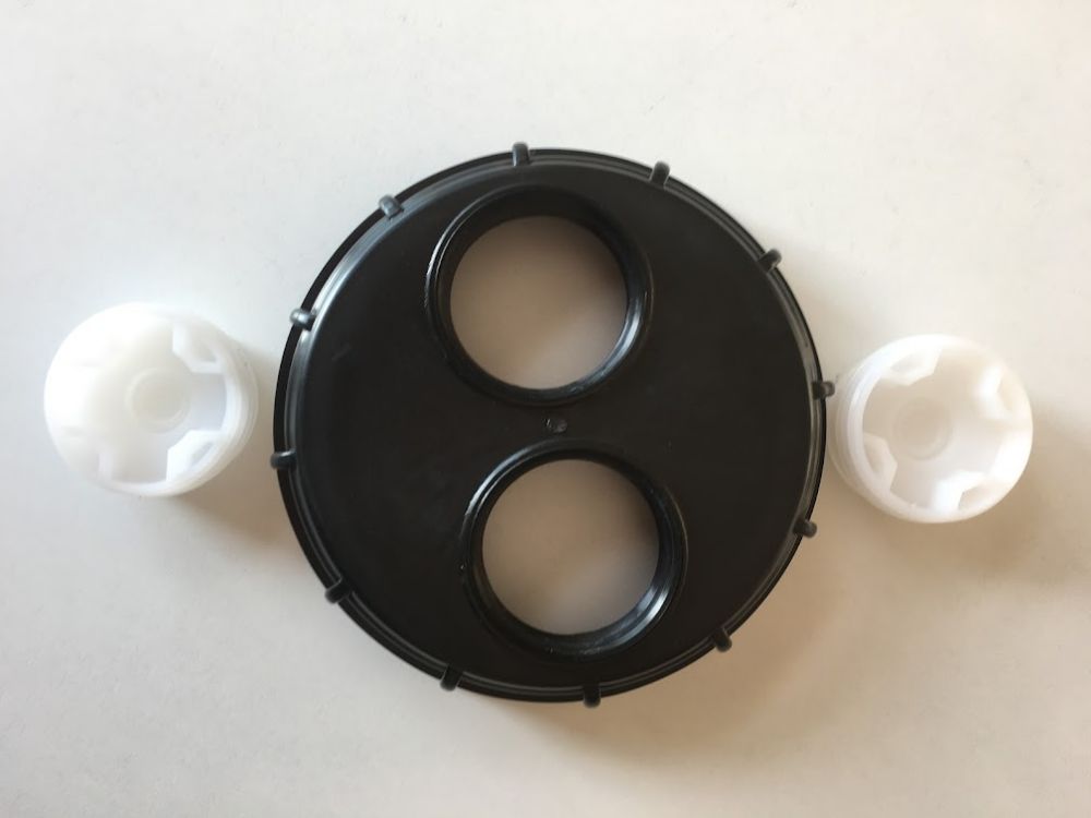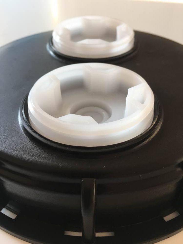 Víko pro IBC kontejner na vodu, se dvěma otvory o průměru 60 mm s ucpávkami. Dva otvory ve víku slouží k plnění a odvzdušnění.