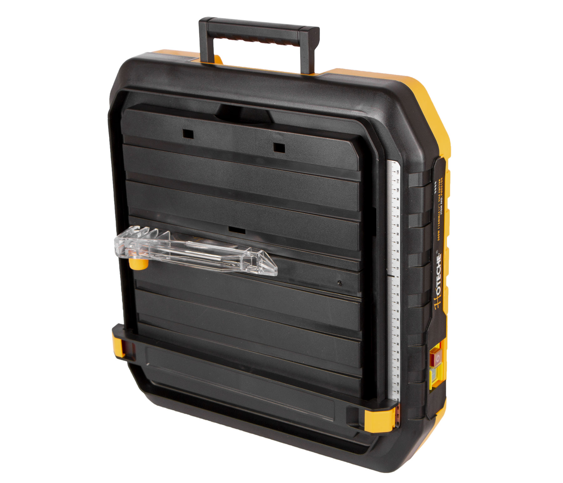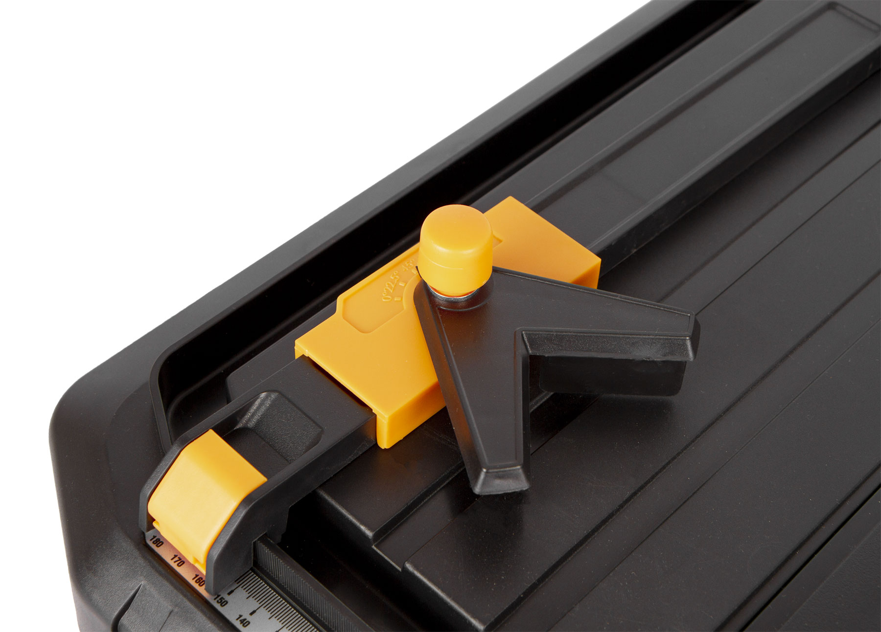 Na přední straně se nachází stupnice s posuvným pravítkem pro snadné měření. Pravítko je dále také opatřeno aretací pro šikmé řezání.