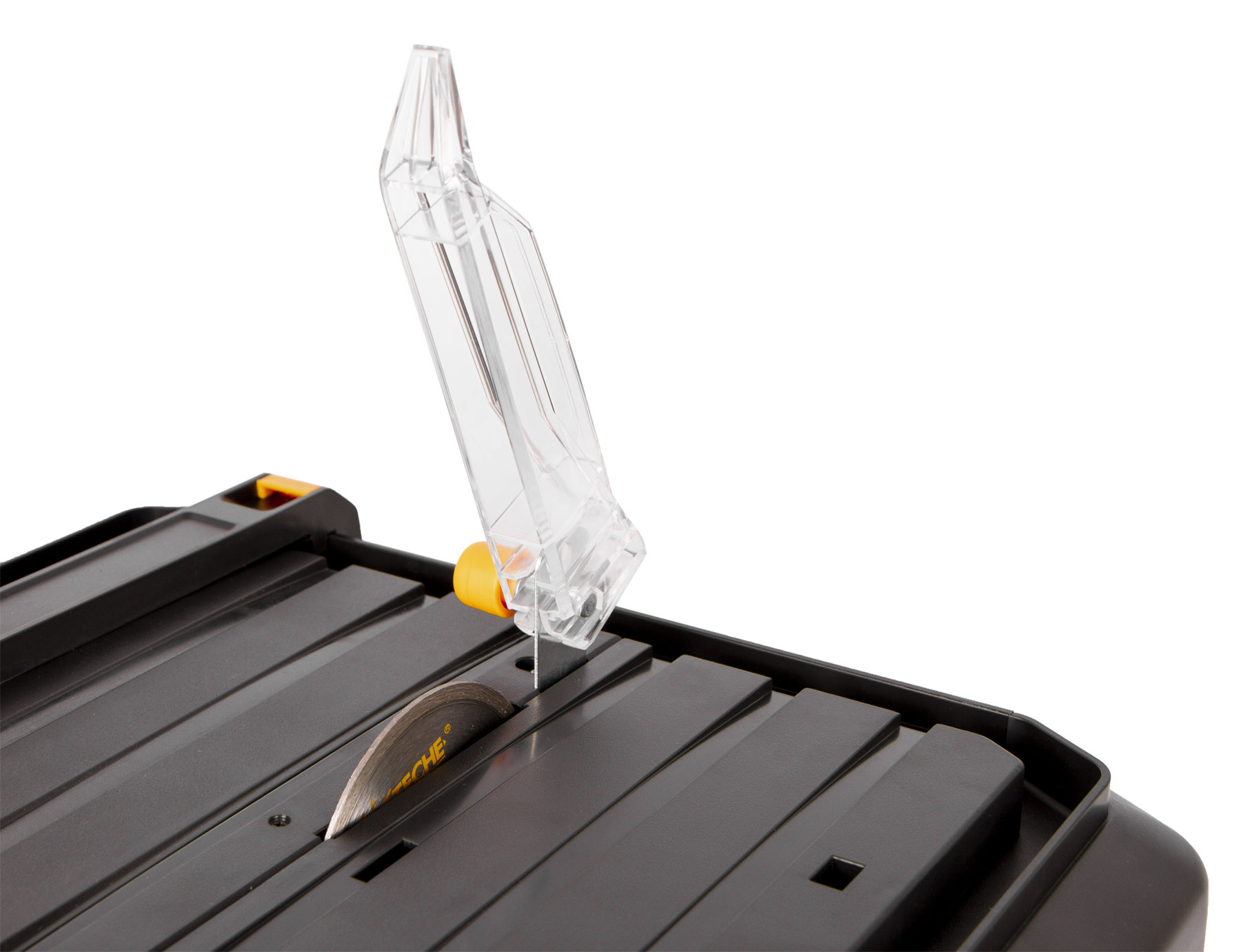 Průhledný sklápěcí kryt kotouče zajišťuje bezpečnou práci a stálý výhled na řez.