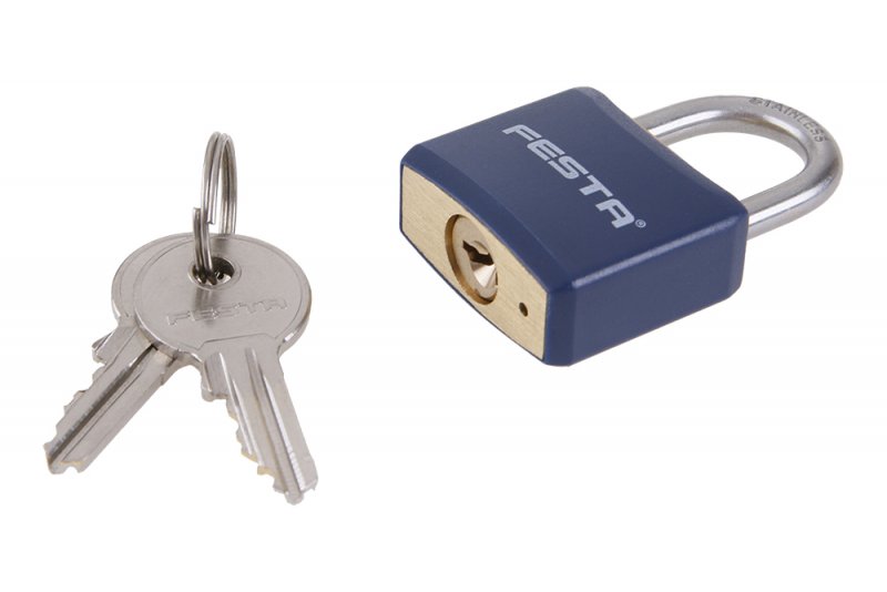 Visací zámek s mosazným tělem a nerezovým obloukem. Mosazné tělo zámku je poplastované. 2 klíče.