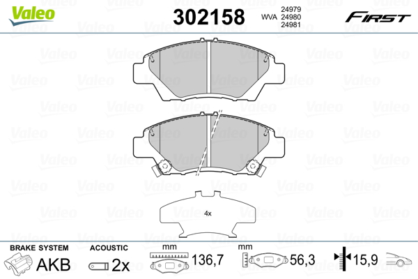 VALEO 302158 - Sada brzdových destiček, vždy 4 kusy v sadě