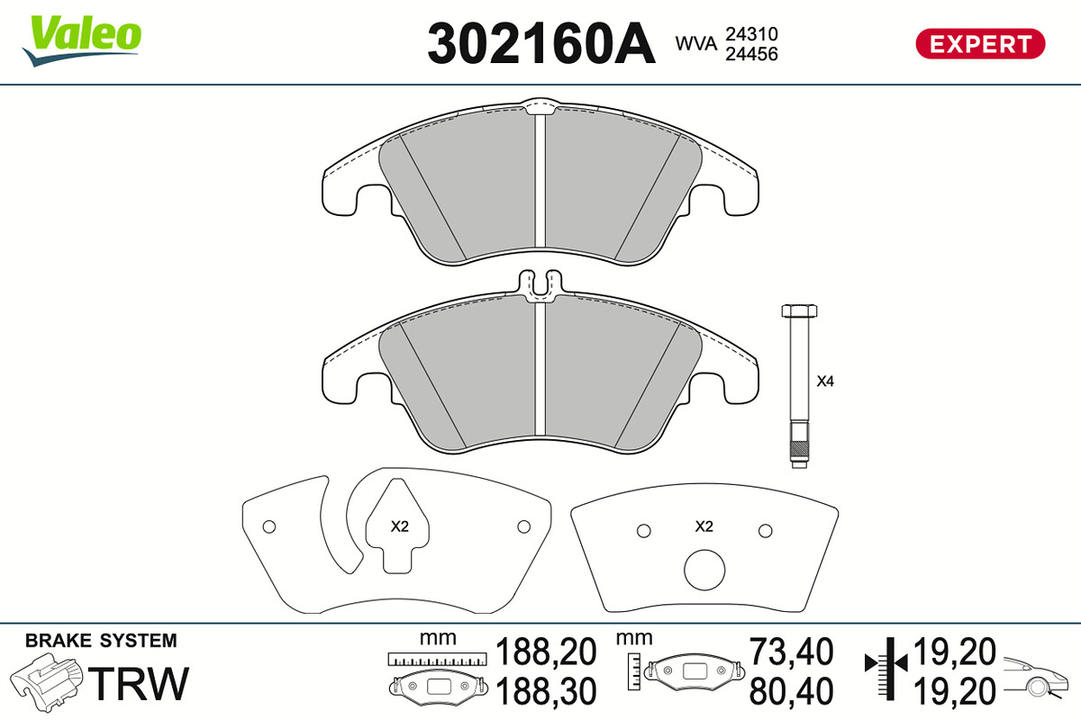 VALEO 302160A - Sada brzdových destiček, vždy 4 kusy v sadě