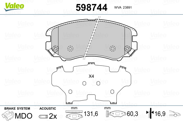 VALEO 598744 - Sada brzdových destiček, vždy 4 kusy v sadě