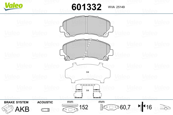 VALEO 601332 - Sada brzdových destiček, vždy 4 kusy v sadě