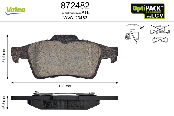 Pro náhradní díl VALEO 872482 - Sada brzdových destiček, vždy 4 kusy v sadě bohužel aktuálně nemáme náhradu.