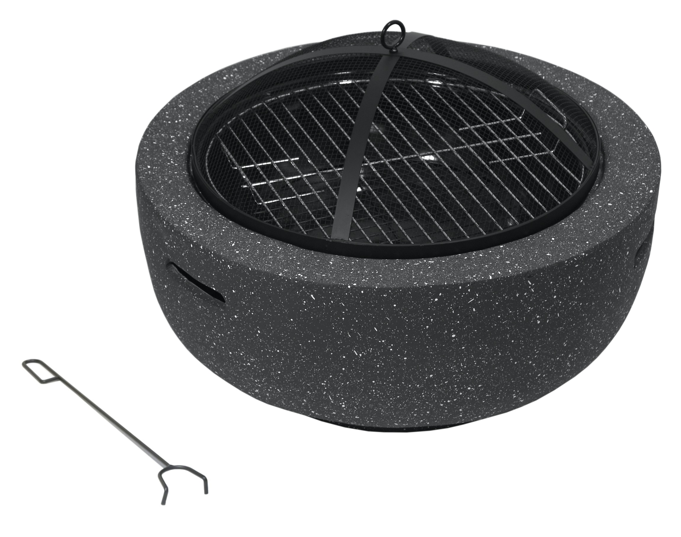 Speciálně tvarovaný poklop s pletivem poslouží jako ochrana před jiskrami, což výrazně zvyšuje bezpečnost a pohodlí. K ohništi je navíc přiložen i praktický pohrabáč na uhlíky.