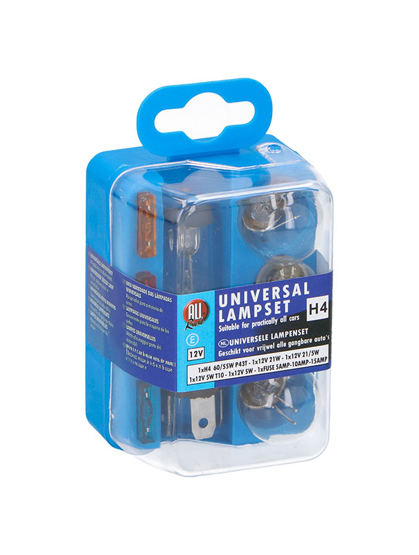 Univerzální set žárovek vhodný prakticky pro všechny osobní automobily. Set obsahuje žárovky: 1 ks H4 60/55 W, 1 ks 12 V 21 W, 1 ks 12 V 21/5 W, 1 ks 12 V 5 W T10 a 1 ks 12 V 5 W. Dále set obsahuje pojistky: 1 ks 5 A, 1 ks 10 A a 1 ks 15 A.
