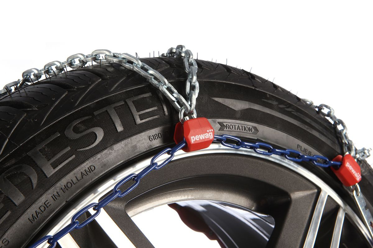 Díky šikmé stopě středové příčky sněhových řetězů Pewag dochází v tomto místě kromě přenosu bočního vedení i k přenosu trakce brzdných a rozjezdových sil, která je u řetězů s rovným vedením minimální.